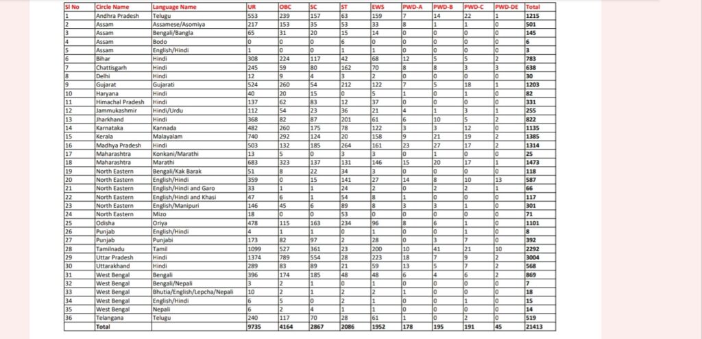डाक विभाग की यह 21413 पदों की भर्ती भारत के सभी राज्यों के लिए है। इन पदों पर आवेदन करते हुए यह खास ध्यान रखना होगा कि आपको उस राज्य की भाषा आती हो। अभ्यर्थियों नीचे दिए गई जानकारी से राज्य की भाषा और वैकेंसी देख सकते हैं।